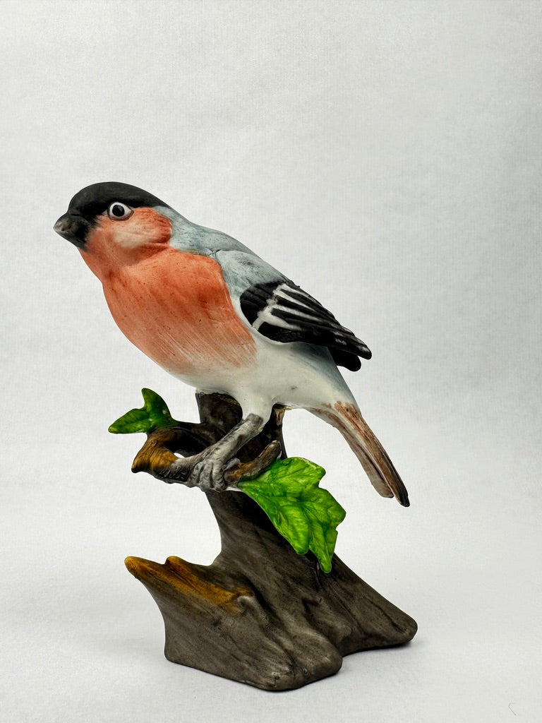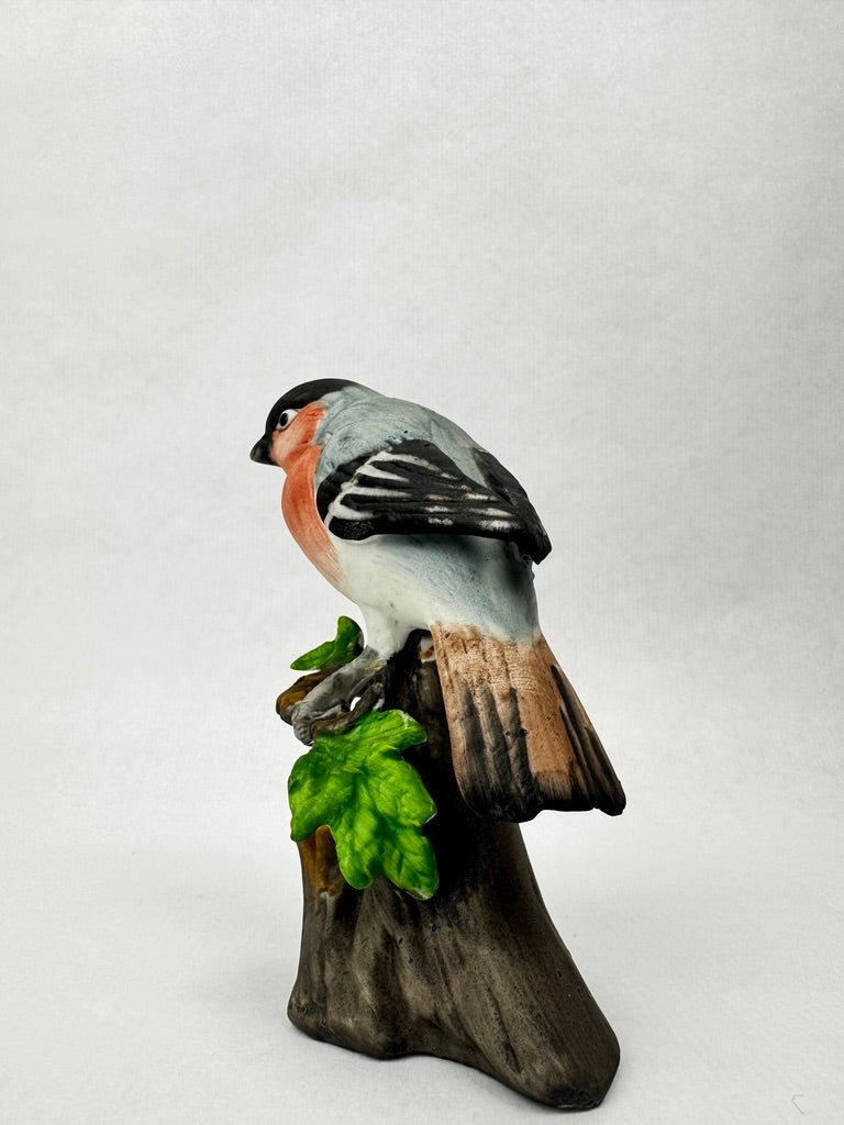 Charmante figurine d’un bouvreuil pivoine en porcelaine non émaillée, perchée sur une branche feuillue.