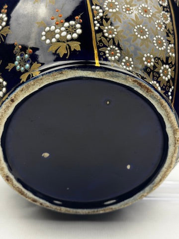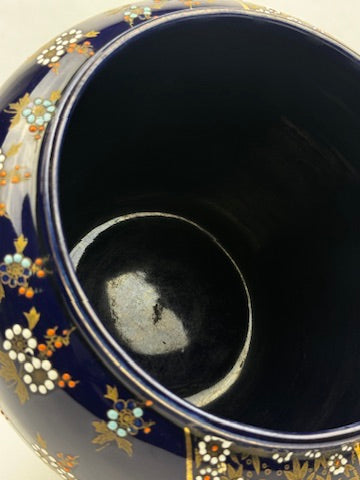 Élégant modèle bombé à fond bleu de Four, entièrement rehaussé de fleurs en relief émaillé et d’un décor or finement ciselé. Alternance de panneaux fleuris et de bandes florales denses séparées par des filets dorés. Travail raffiné d’un atelier limougeaud de la Belle Époque, dans le goût des décors dits “Nippon”.