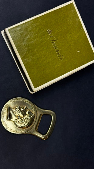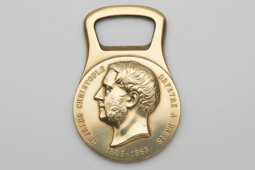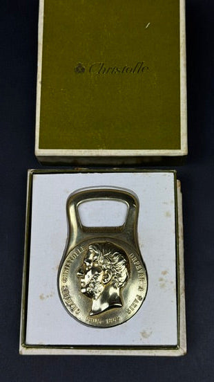 Décapsuleur en métal doré de la maison Christofle, orné d’un médaillon en relief représentant Charles Christofle (1805–1863), fondateur de la célèbre maison d’orfèvrerie parisienne. Ce type d’objet commémoratif a été édité par Christofle dans la seconde moitié du XXᵉ siècle, principalement à destination des amateurs et collectionneurs de la marque.