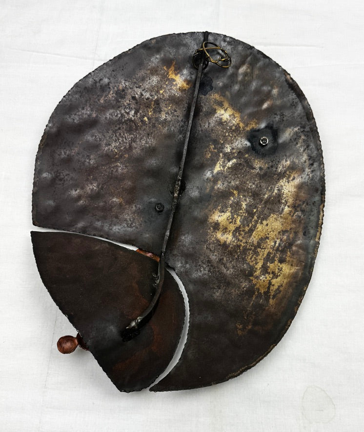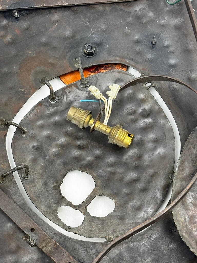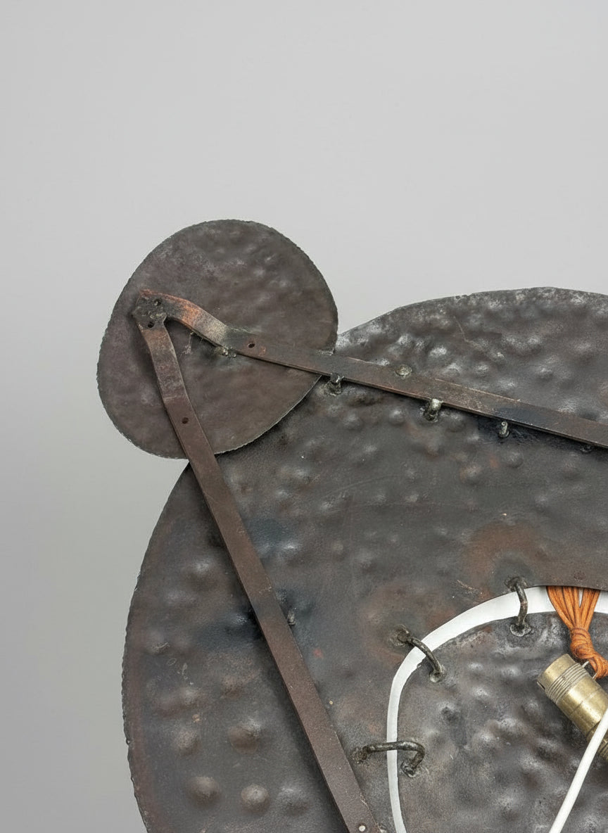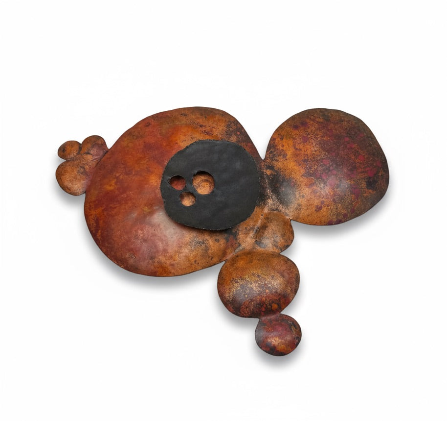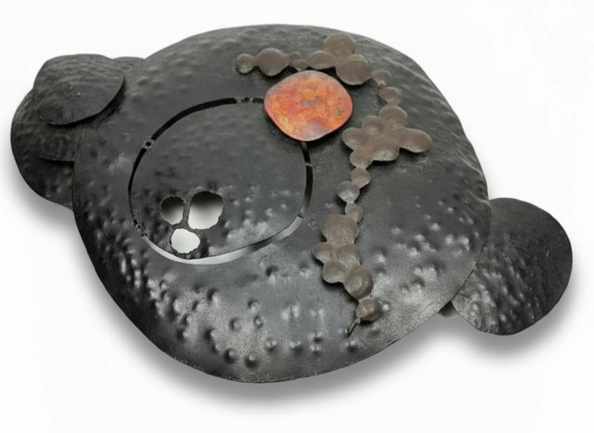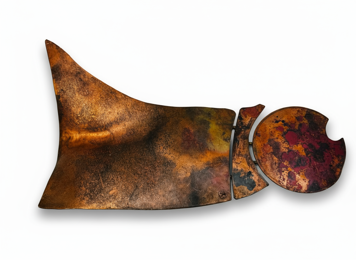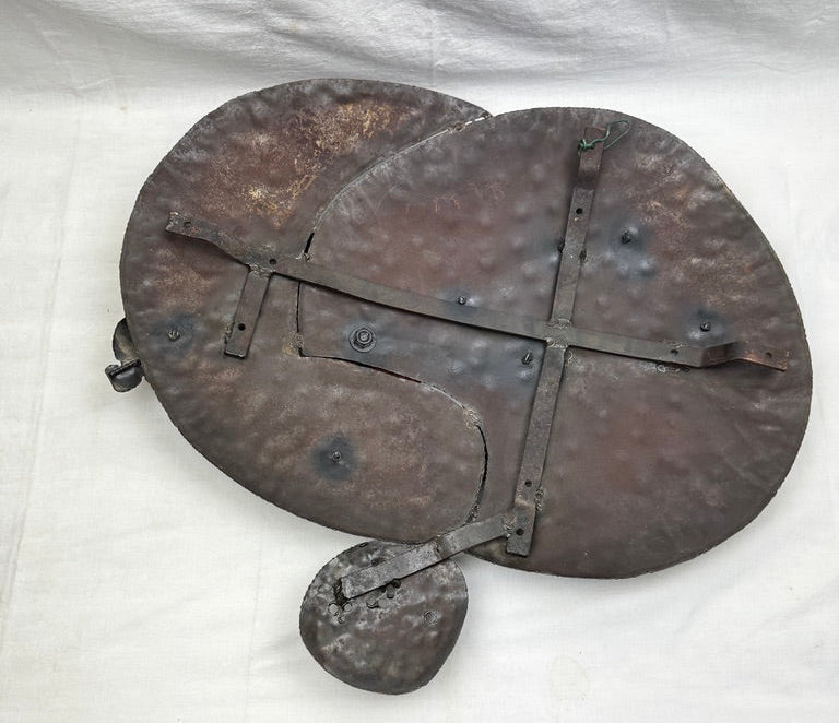 Les surfaces sont profondément texturées, travaillées au marteau et à la flamme, selon une technique proche des ateliers belges et français de cette période (proches de Daniel d’Haeseleer, Marc D’Haenens, Jean Meeus, etc.).