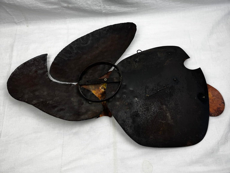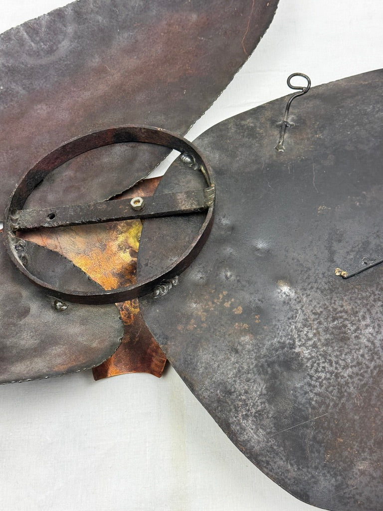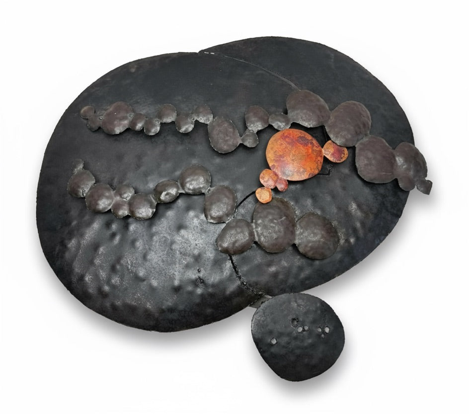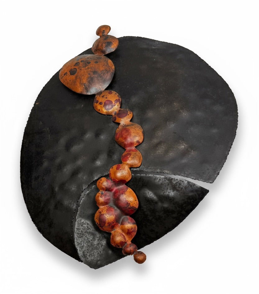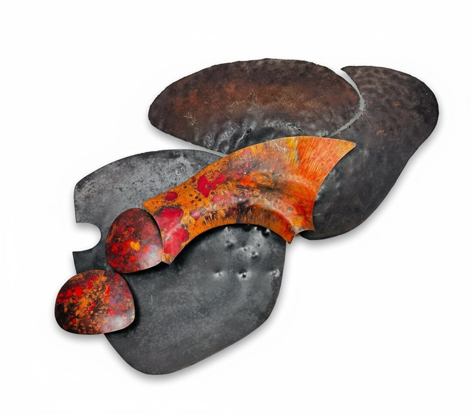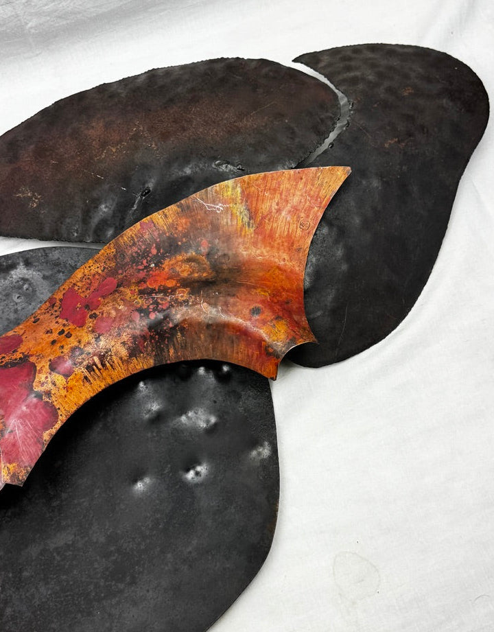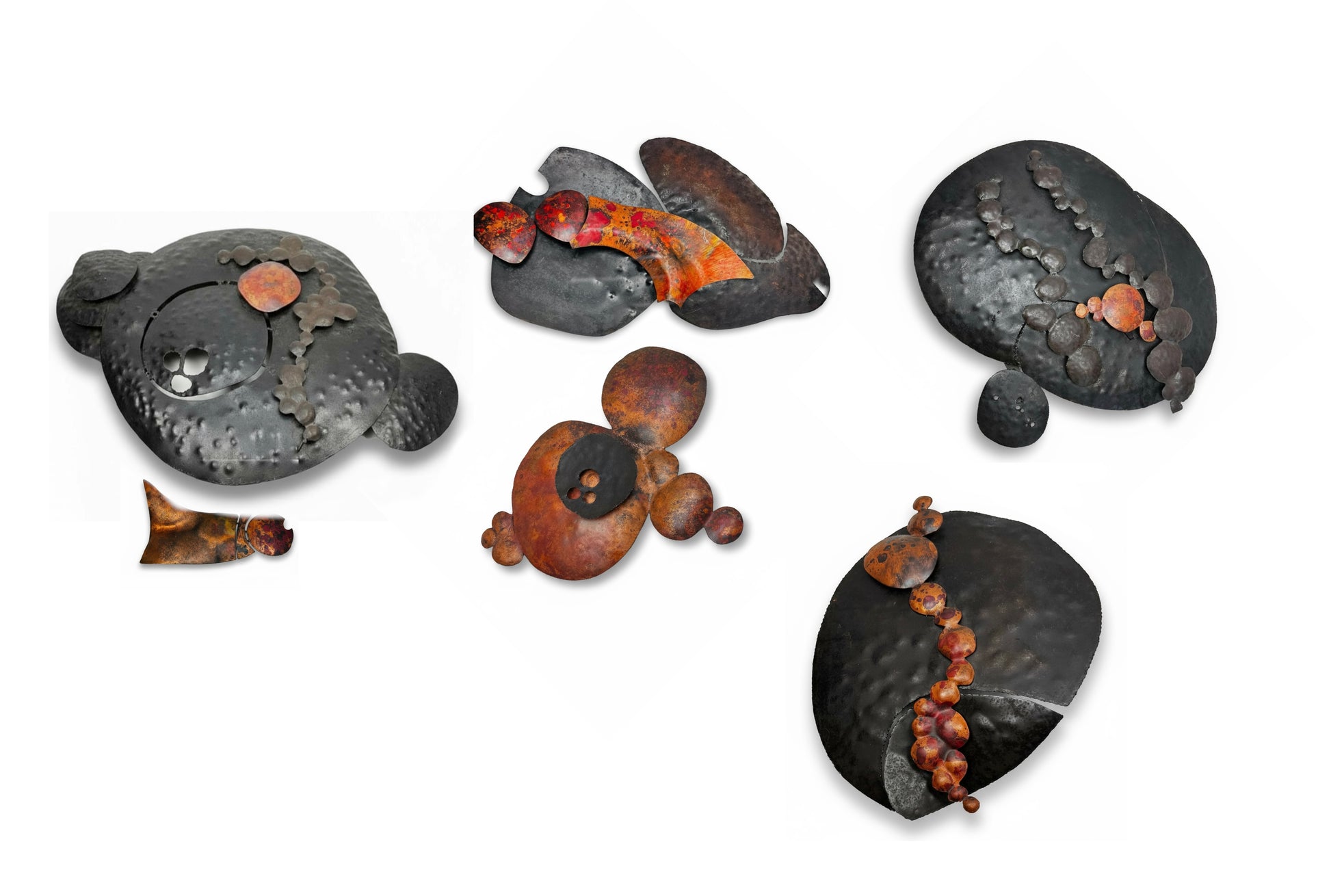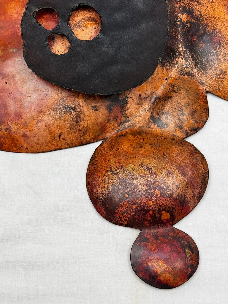 Ensemble de six compositions murales en métal martelé, cuivre, laiton et acier noirci, présentant de magnifiques patines rouges et orangées obtenues par oxydation et brasage.