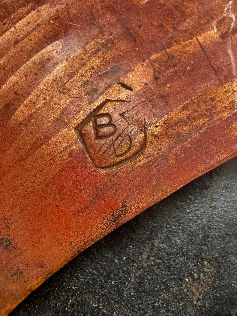 Une pièce porte en creux un poinçon pentagonal "B + D", marque d’atelier peu documentée mais de haute qualité d’exécution, témoignant d’un travail de ferronnerie d’art professionnel.