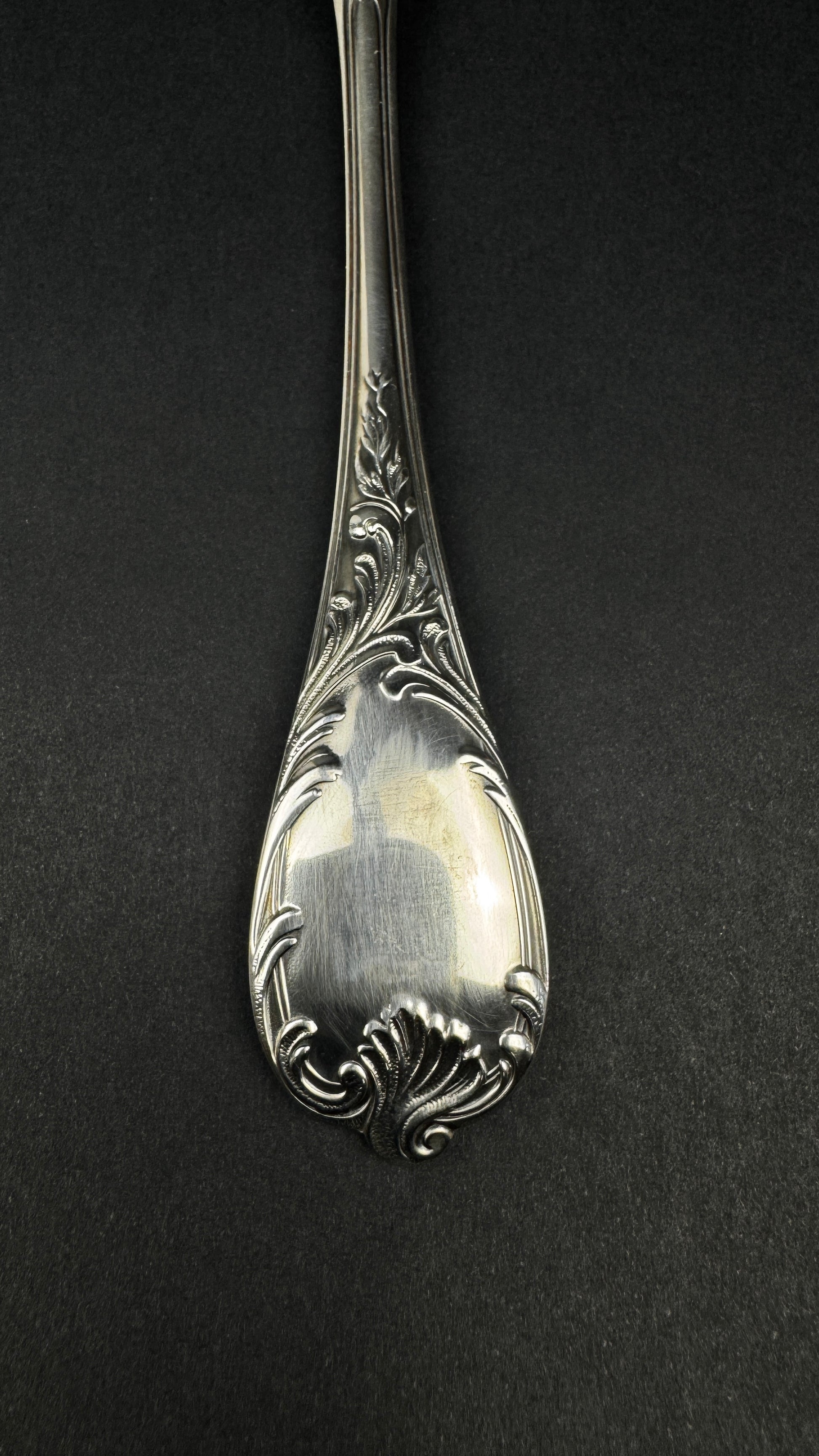 Le modèle Marly est l’un des décors les plus emblématiques de Christofle. Inspiré du style Louis XV et du vocabulaire rocaille du XVIIIe siècle, il se distingue par une ciselure riche de coquilles, feuillages et enroulements asymétriques. Ce modèle constitue un pilier des grandes ménagères françaises du XXe siècle.