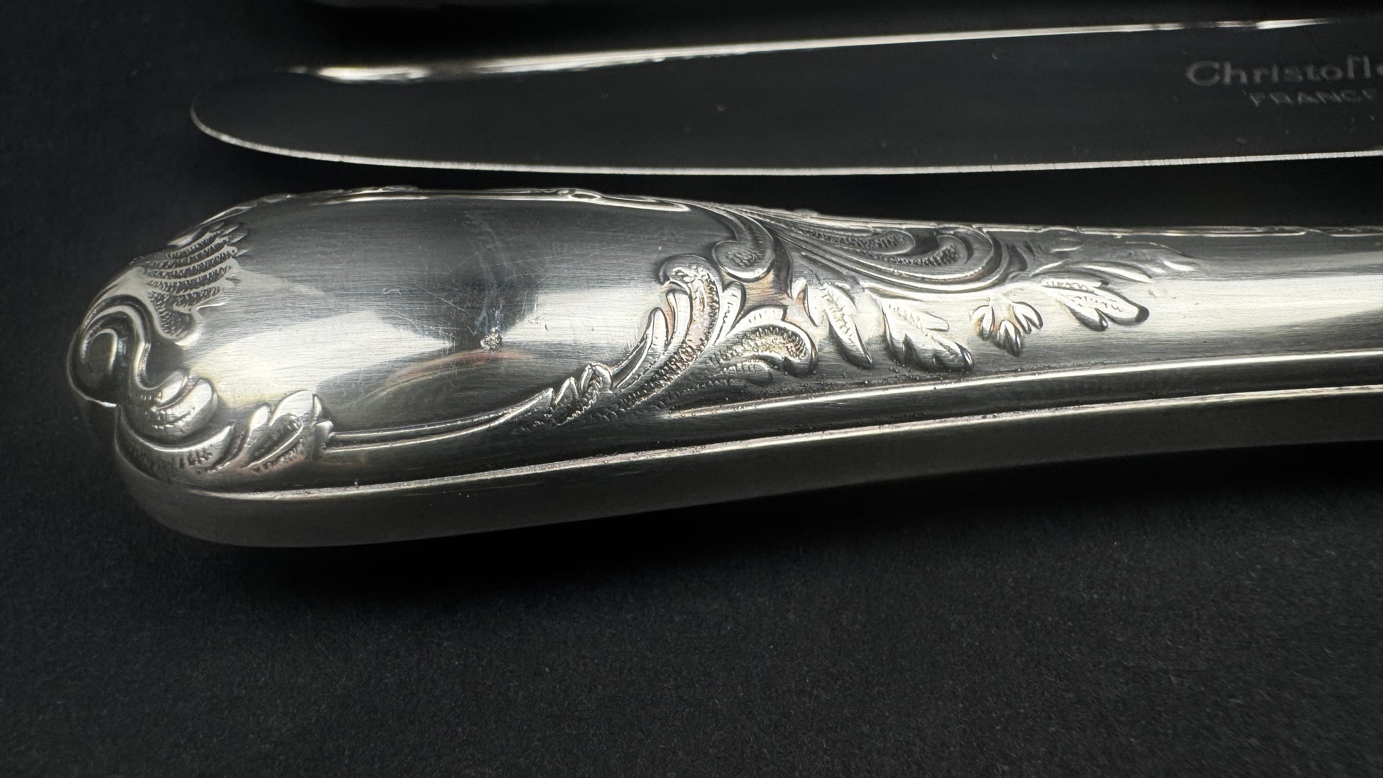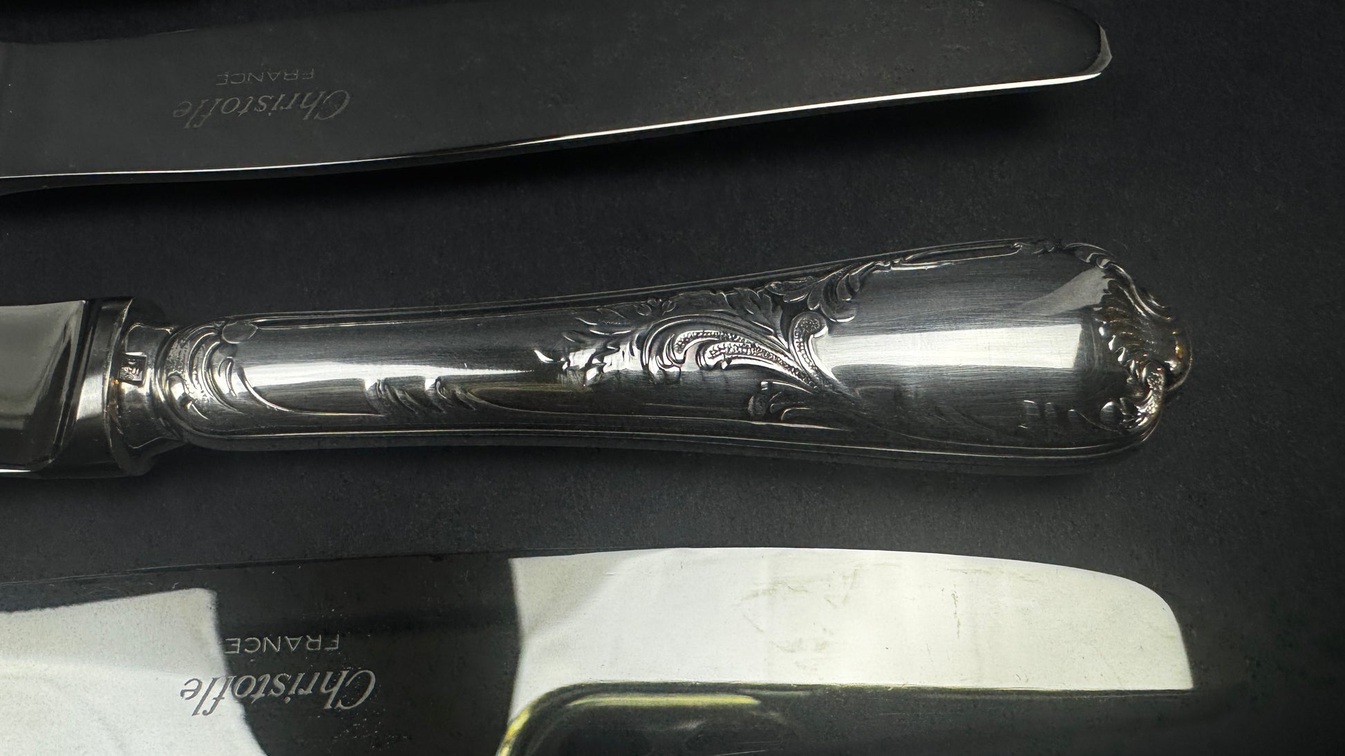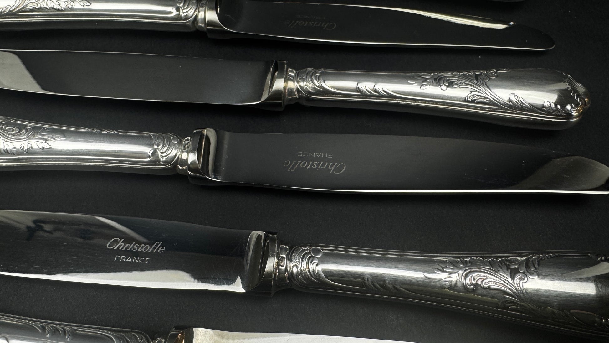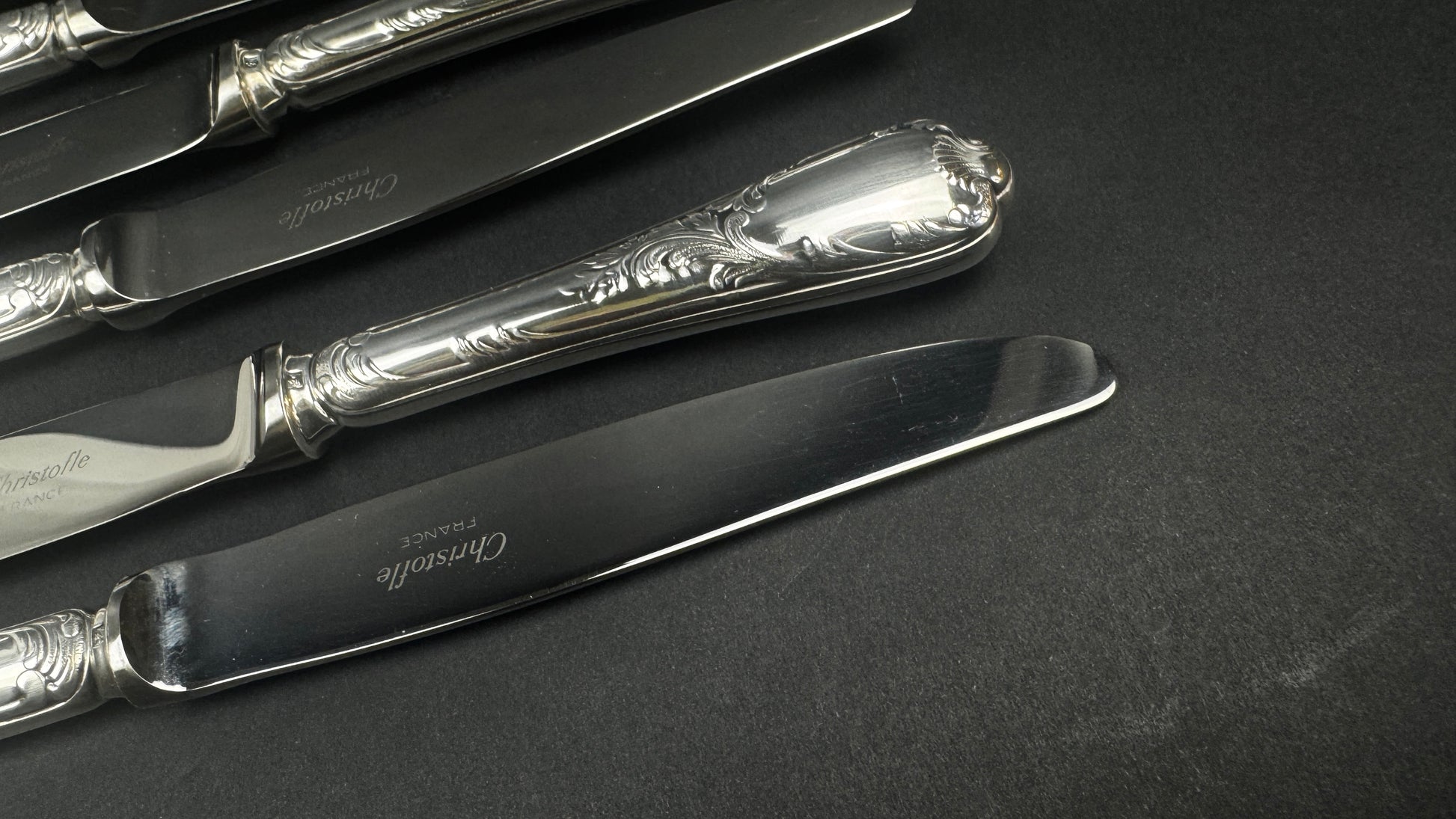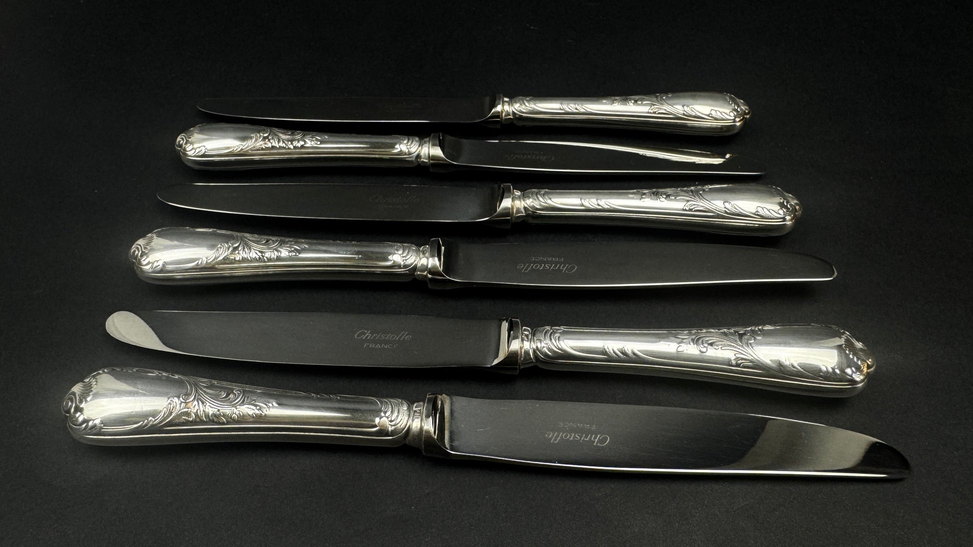 Modèle Marly, l’un des grands classiques du catalogue Christofle, reconnaissable à son décor rocaille élégant et équilibré. Lames inox marquées Christofle France, manches en métal argenté finement ciselé. Format intermédiaire parfaitement adapté au service du fromage.