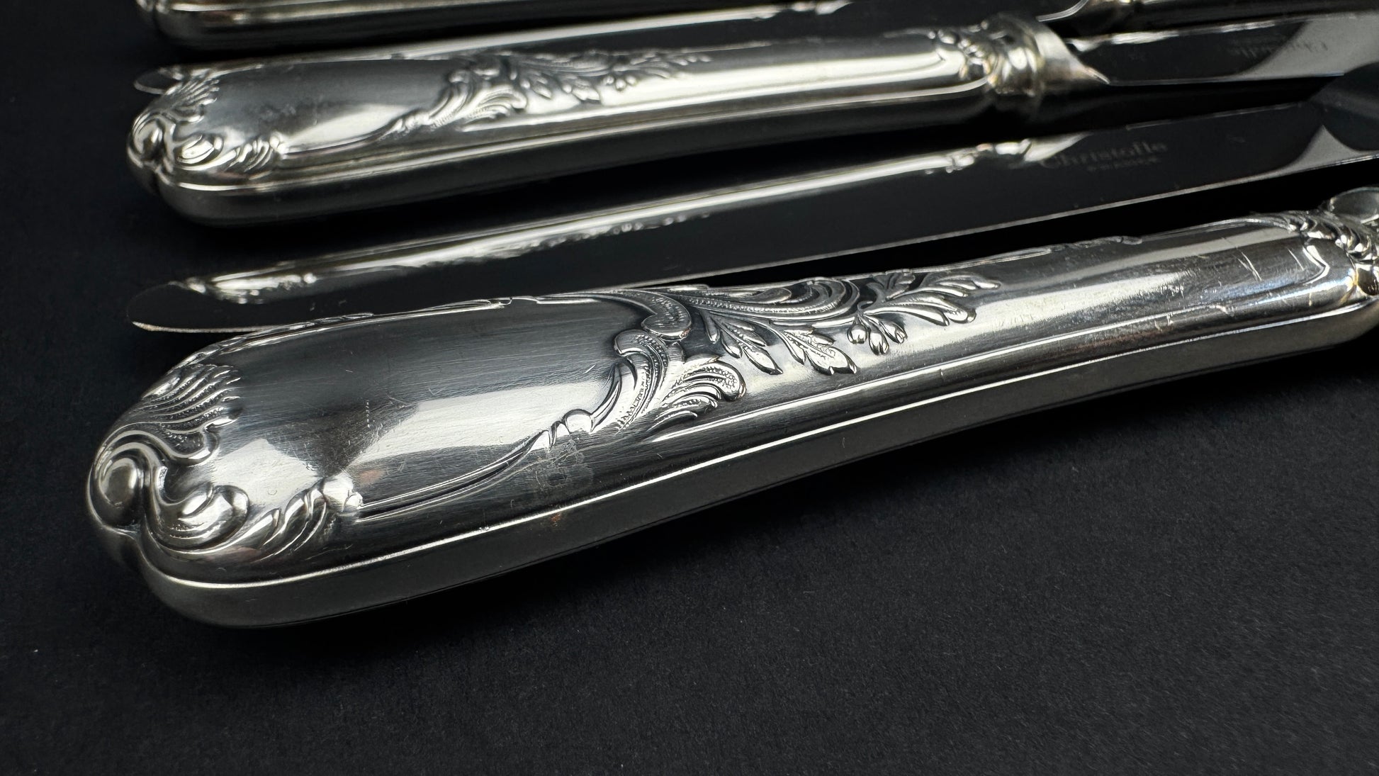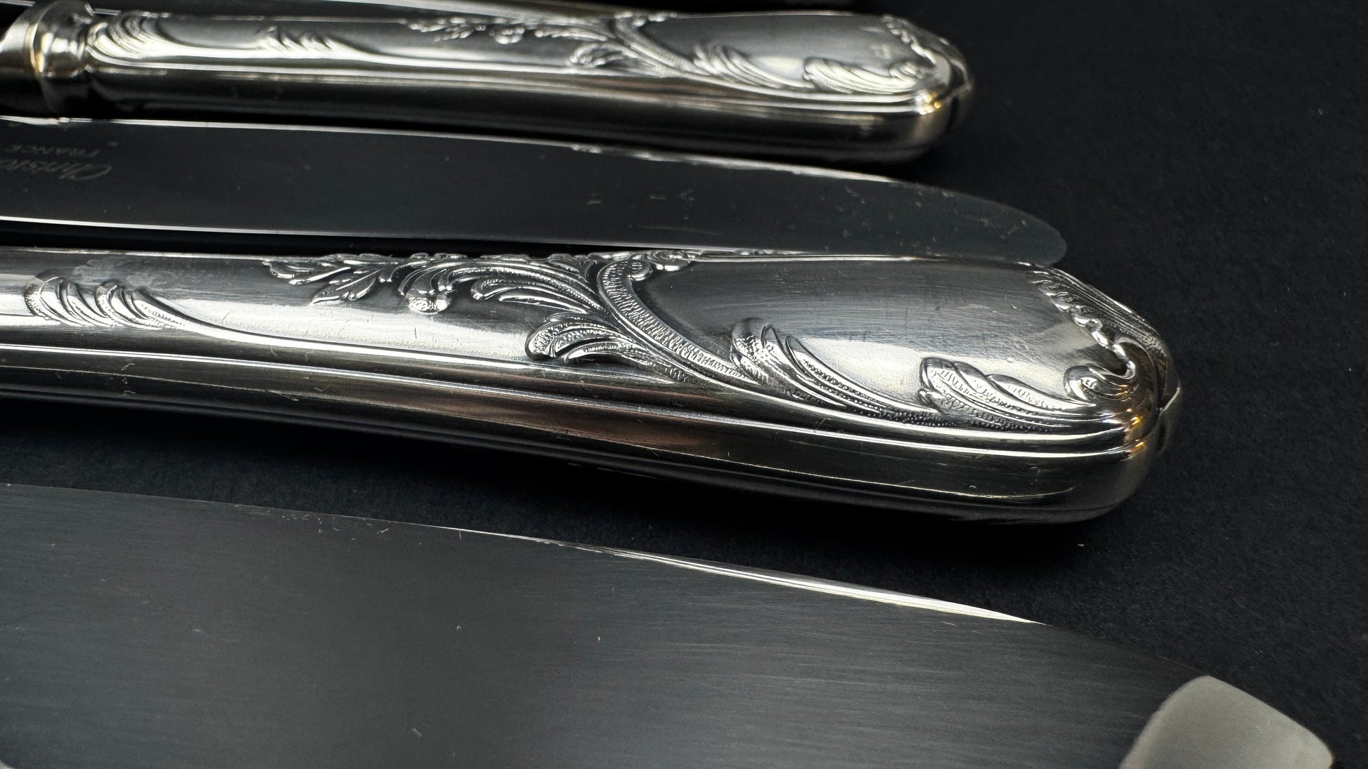 Lames en acier inoxydable marquées Christofle France, montage classique de belle qualité.