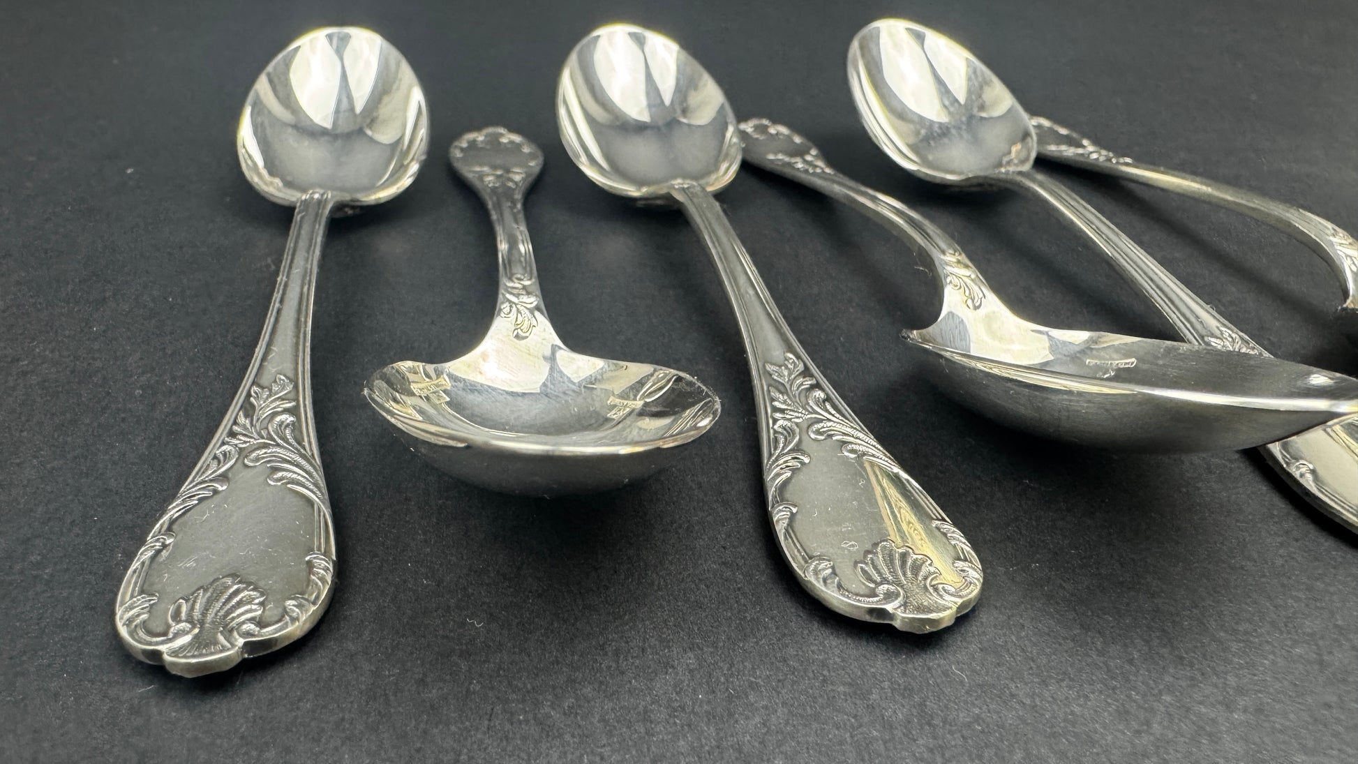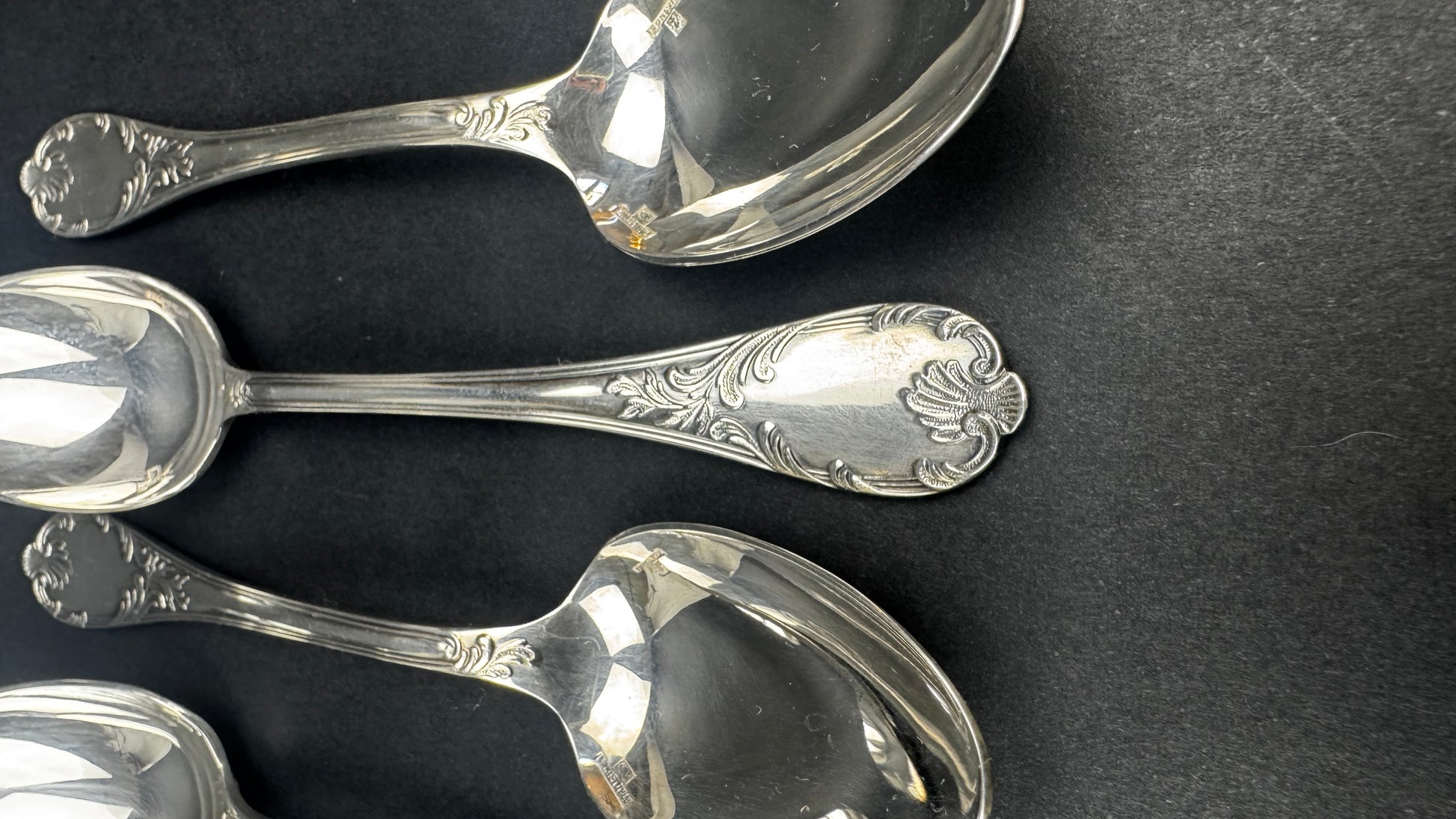 Suite de six cuillères en métal argenté de la maison Christofle, modèle Marly, l’un des décors les plus emblématiques de l’orfèvrerie française du XXᵉ siècle.