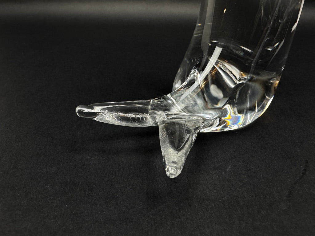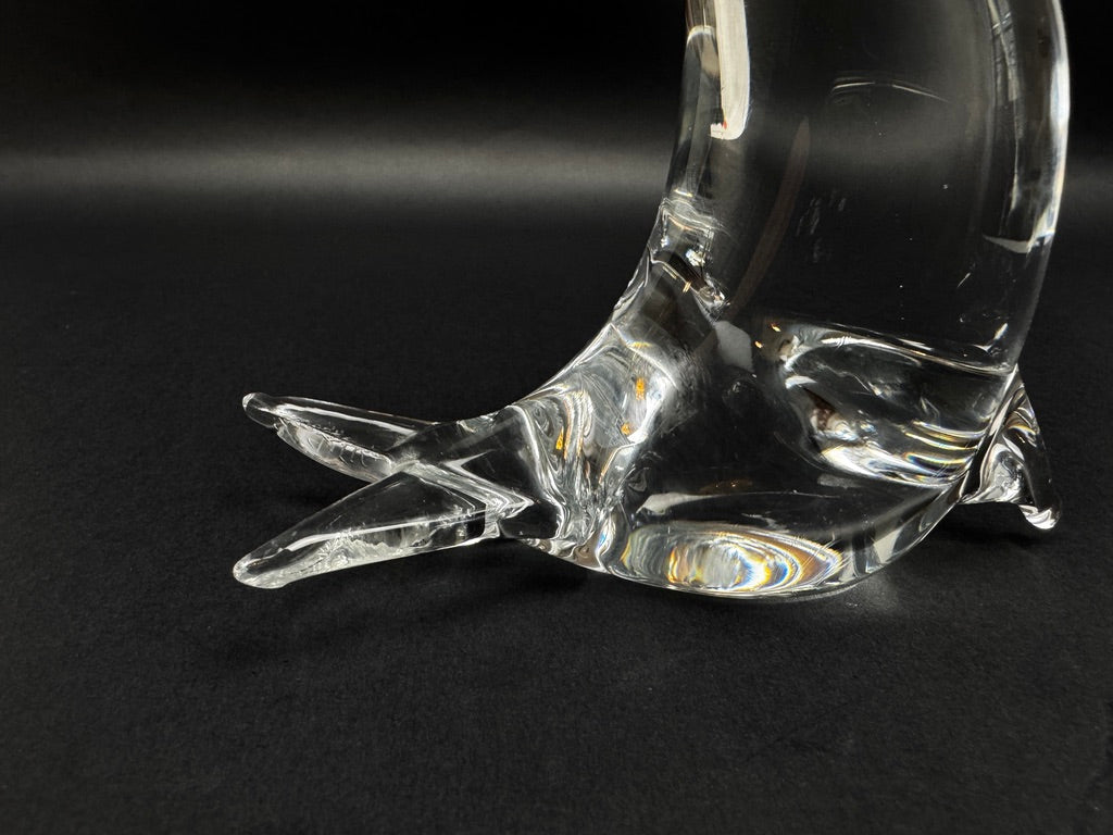 Superbe otarie en verre clair de Murano, représentant l’animal dressé sur ses nageoires, tenant un ballon en équilibre sur le museau.