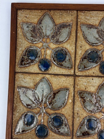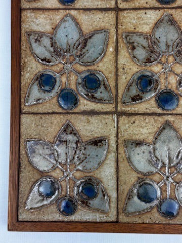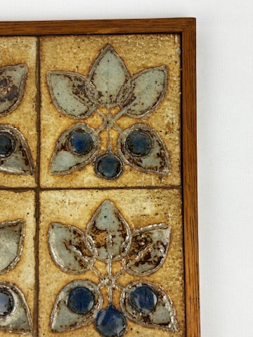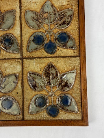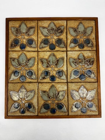 Composition murale de neuf carreaux émaillés à décor floral stylisé, aux tons beiges, bruns et bleus, montée sur un support en bois. Chaque carreau présente un relief travaillé, typique des productions scandinaves et d’Europe du Nord des années 1960-70.