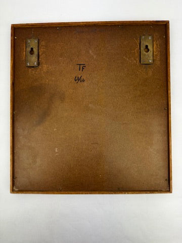 Le panneau est signé au dos du monogramme TF et numéroté 61/66, indiquant un tirage limité. On y lit également la mention manuscrite « Tanu n°50 ». Le décor, réalisé en émaux aux glaçures mates et brillantes, rappelle les œuvres des ateliers danois et suédois de la période moderniste, combinant artisanat et abstraction décorative.