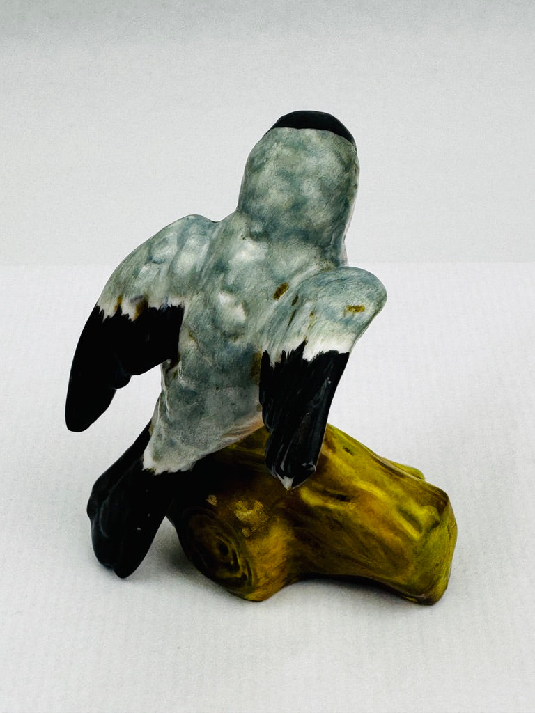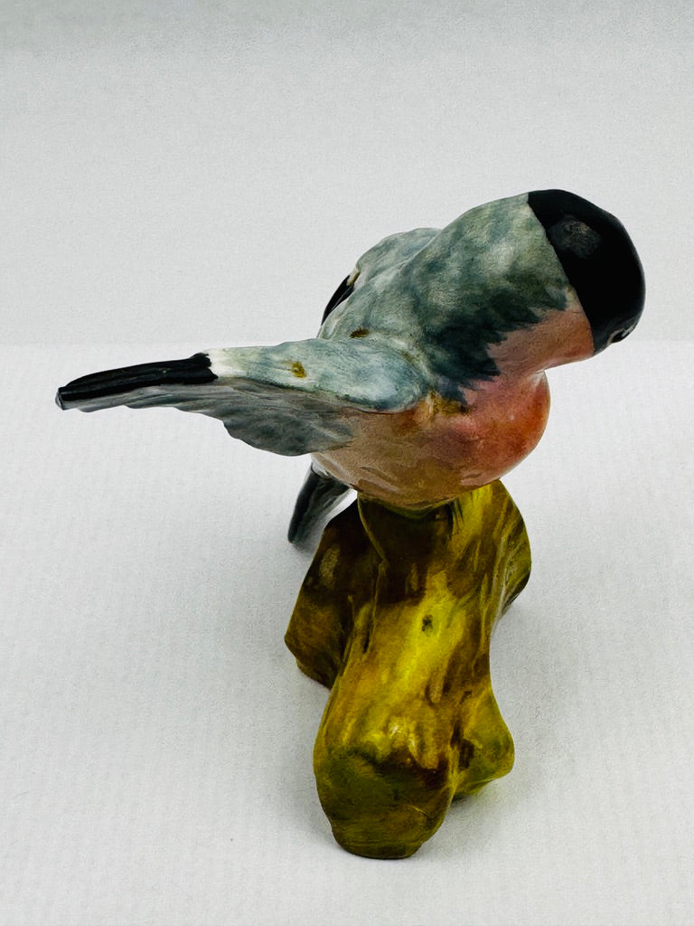 Modèle emblématique des années 1950-1960, peint à la main avec un grand réalisme : dégradé du plastron rouge orangé, nuances de gris et de noir sur le plumage, base émaillée vert mousse évoquant un tronc moussu.