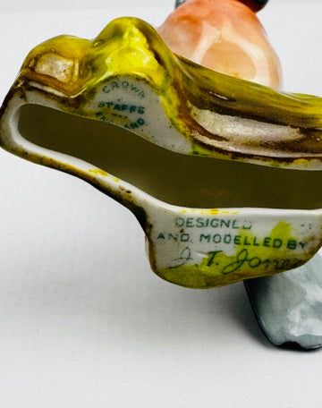 Sous la base : double marquage vert Crown Staffs England et mention Designed and modelled by J. T. Jones.