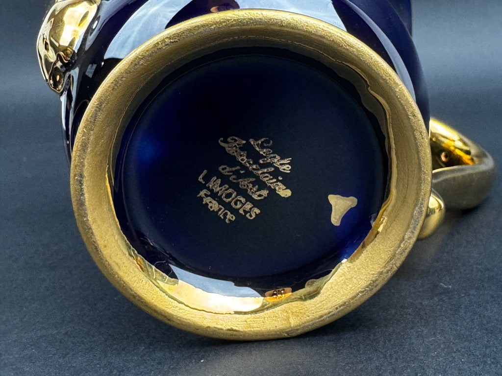 Porcelaine émaillée bleu de Four, rehaussée d’un large bandeau or finement ciselé et d’un intérieur intégralement doré à l’or fin. Les anses et bords sont également rehaussés d’or. Signature dorée sous la base : Legle Porcelaine d’art – Limoges France.