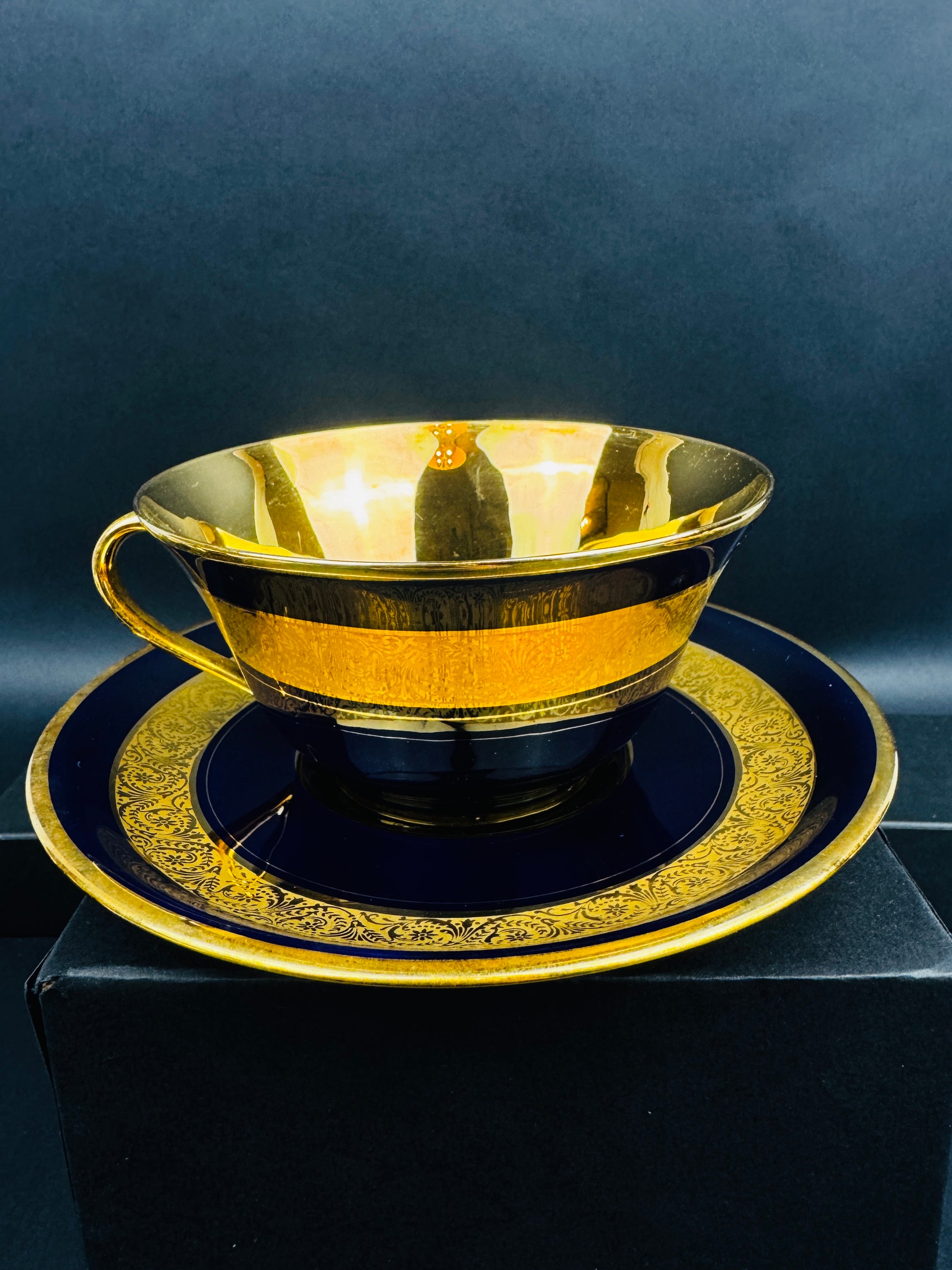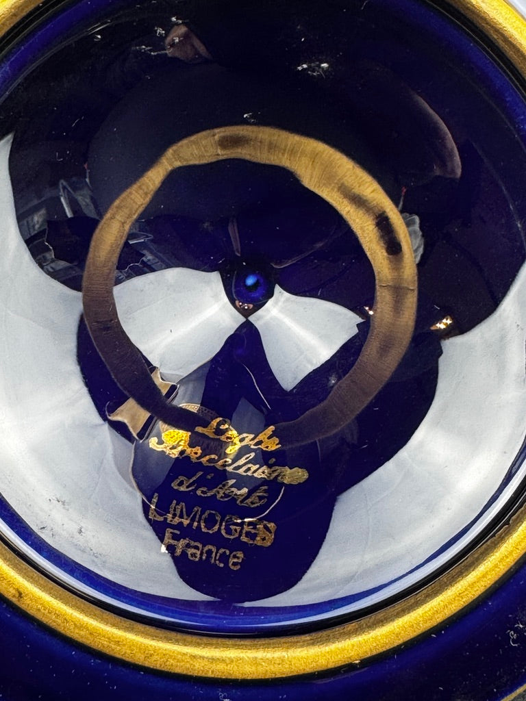 Service à café tête à tête bleu de Four et or Legle Limoges, porcelaine d’art