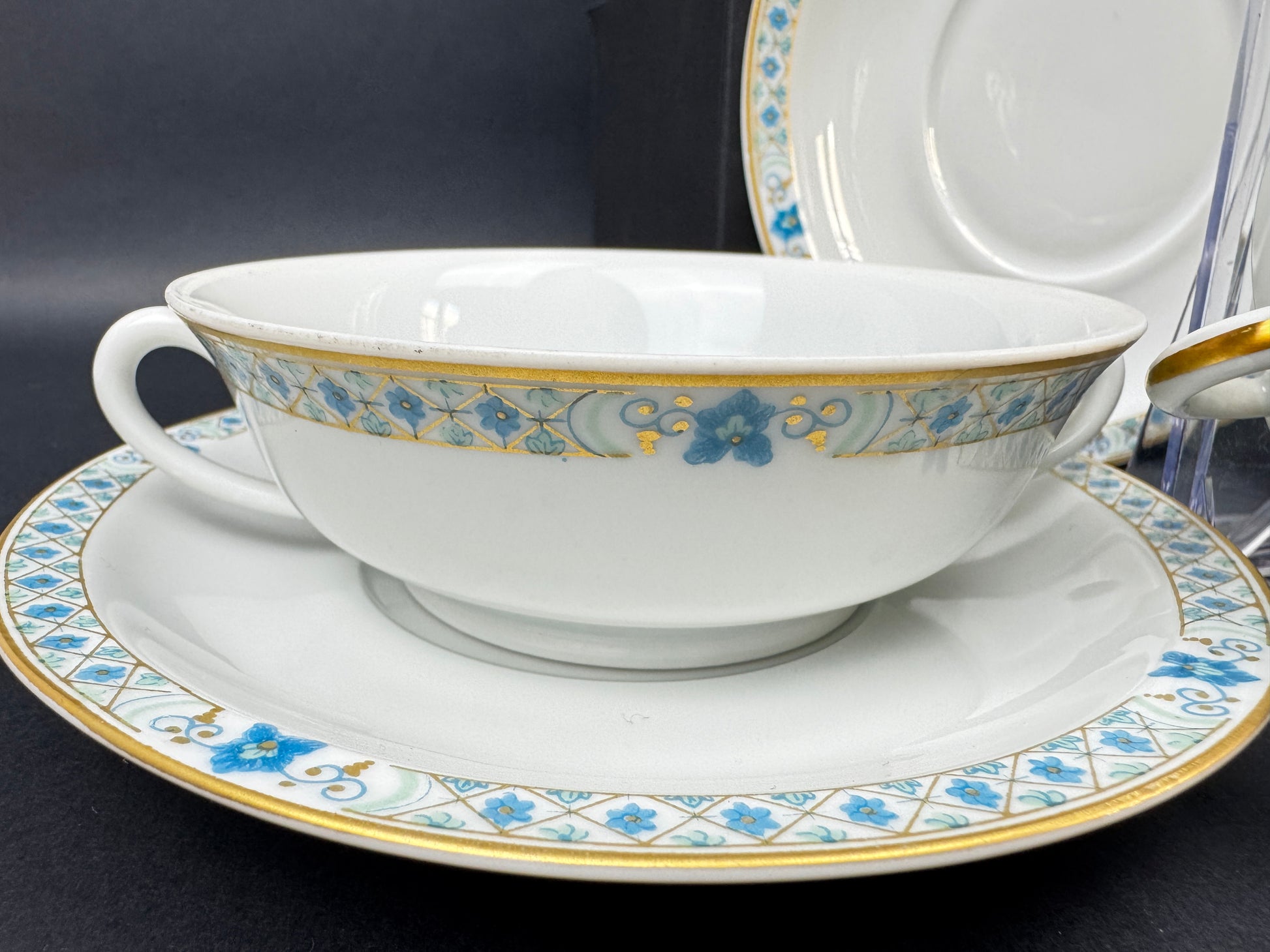 Élégant ensemble de quatre tasses à bouillons et leurs sous-tasses assorties, en porcelaine fine blanche de la manufacture Haviland, Limoges. Modèle Nankin, décor de fleurs bleues au centre et frise à motifs géométriques rehaussée d’or sur les bords.