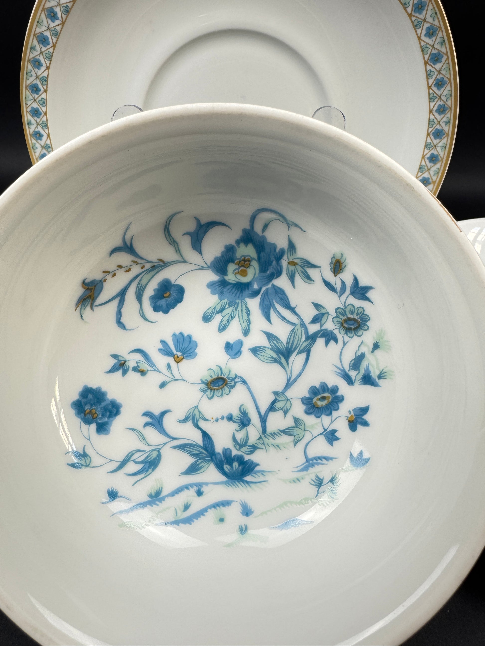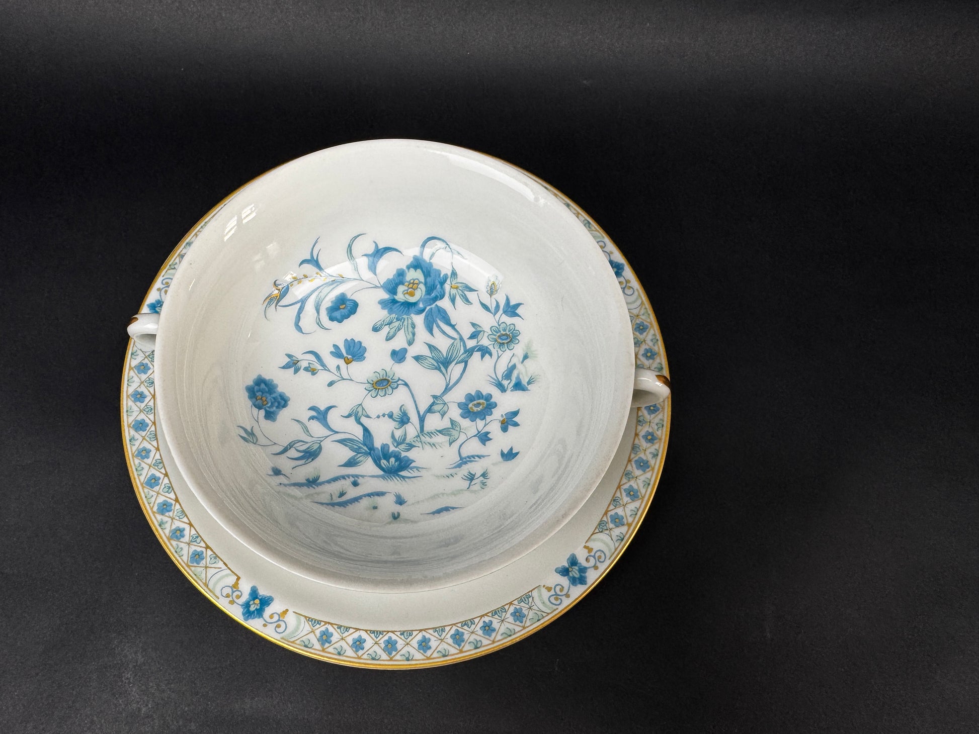 Le modèle Nankin, créé dans les années 1950 par Haviland, revisite les porcelaines d’inspiration extrême-orientale avec un bleu tendre et des rehauts dorés. La composition allie finesse du dessin et équilibre des couleurs. Chaque pièce est tournée dans une pâte fine et translucide, caractéristique des productions Haviland. Dimensions : bouillon diamètre 12 cm, hauteur 4,5 cm ; sous-tasse diamètre 16 cm.