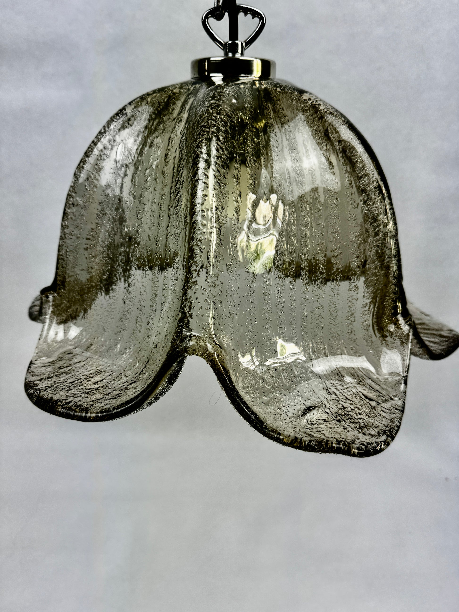 Charmante suspension allemande produite par Briloner Leuchten dans les années 1970, modèle n° 4215/1. Vasque en verre soufflé bullé à ondulations, teinte gris fumé translucide, diffuse une lumière douce et chaude. Structure métallique chromée, douille standard E27.