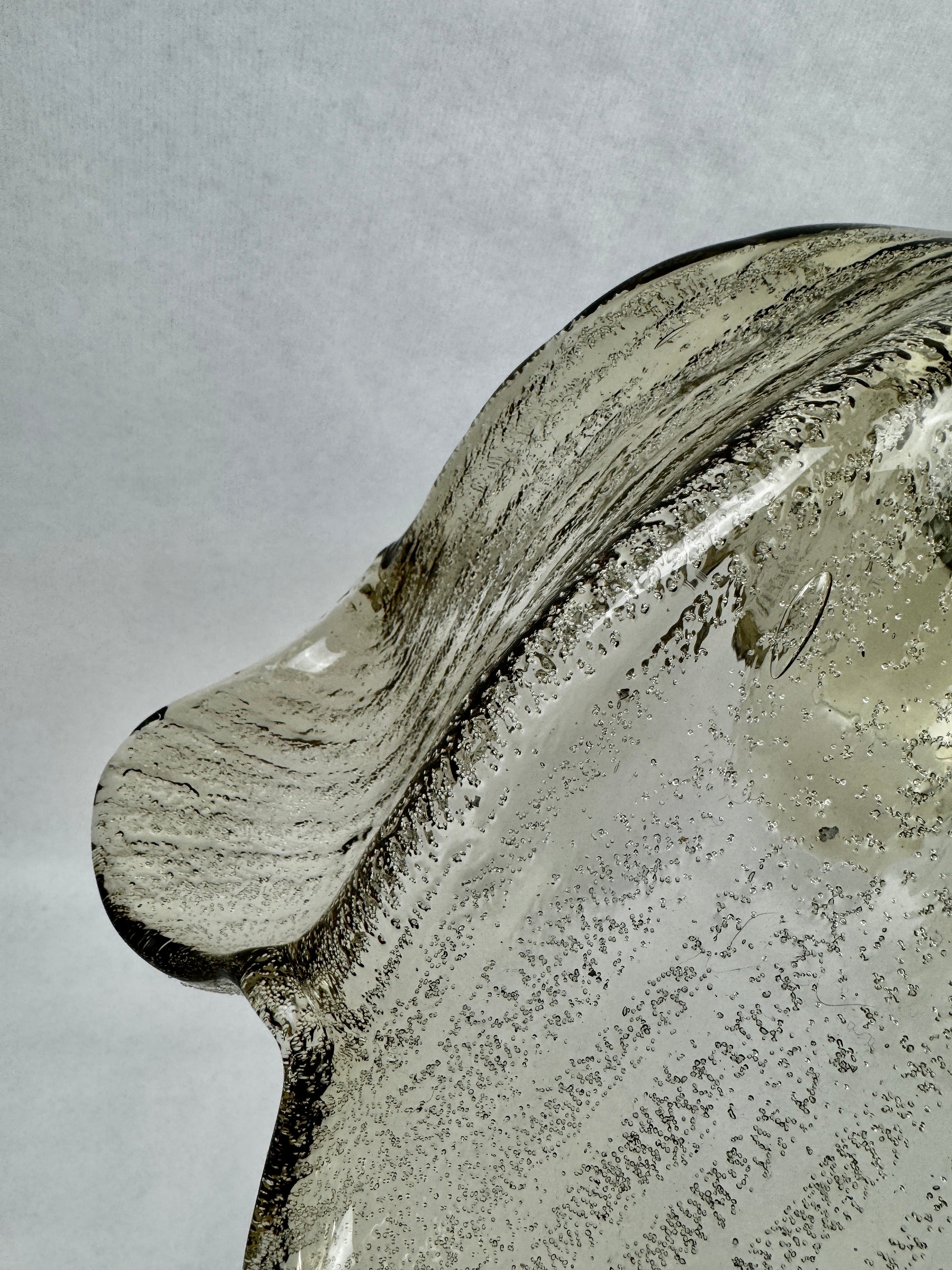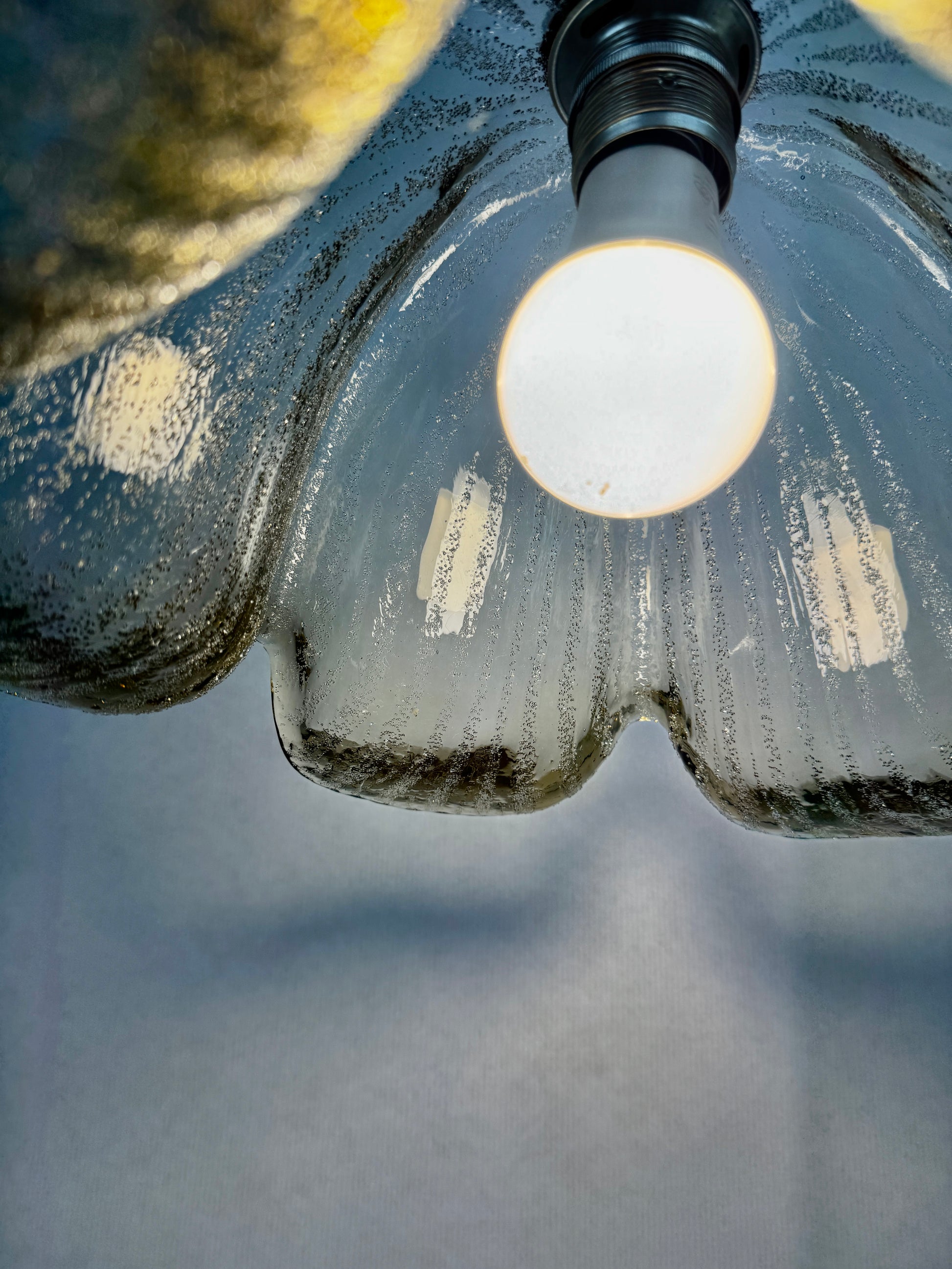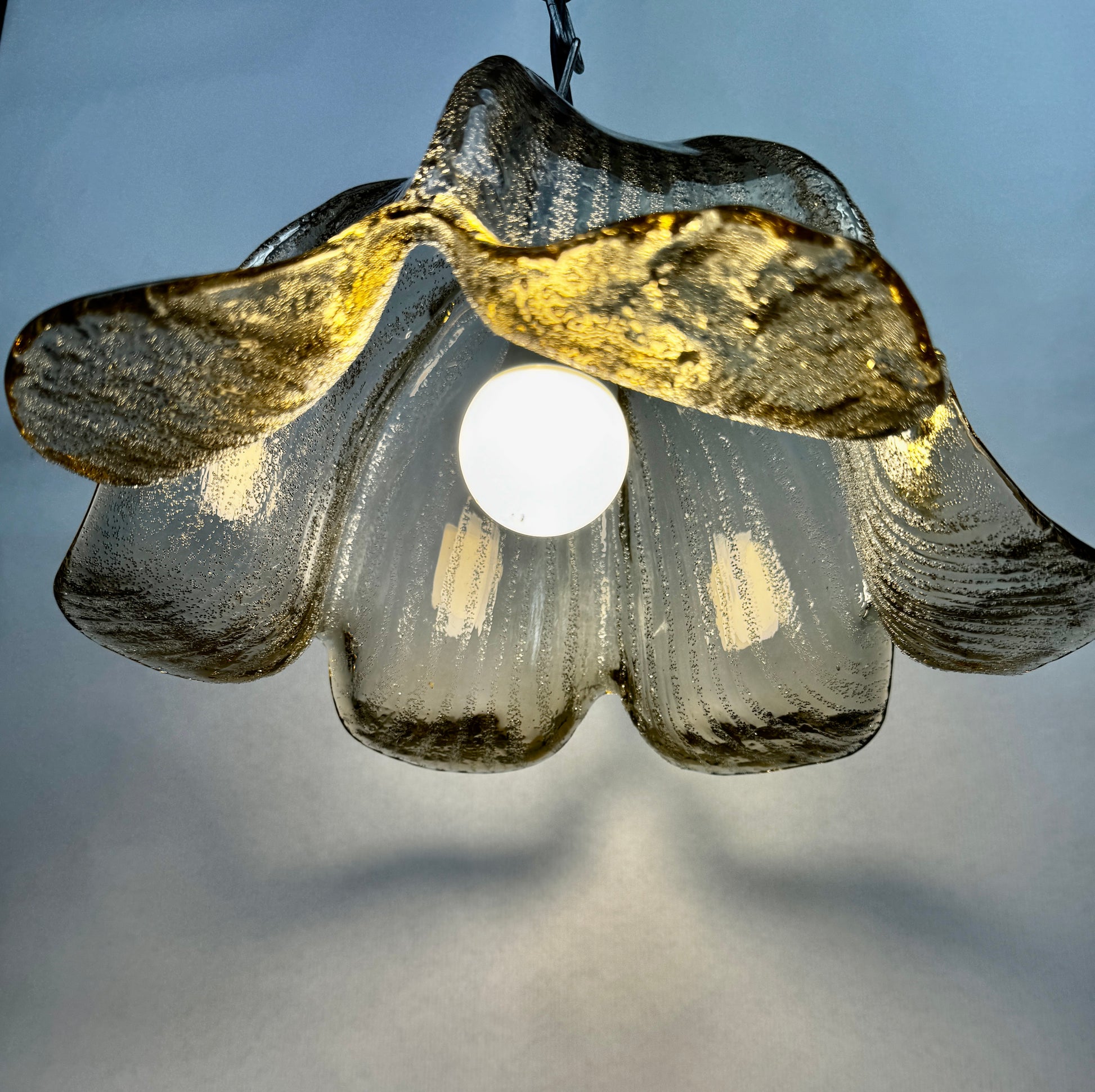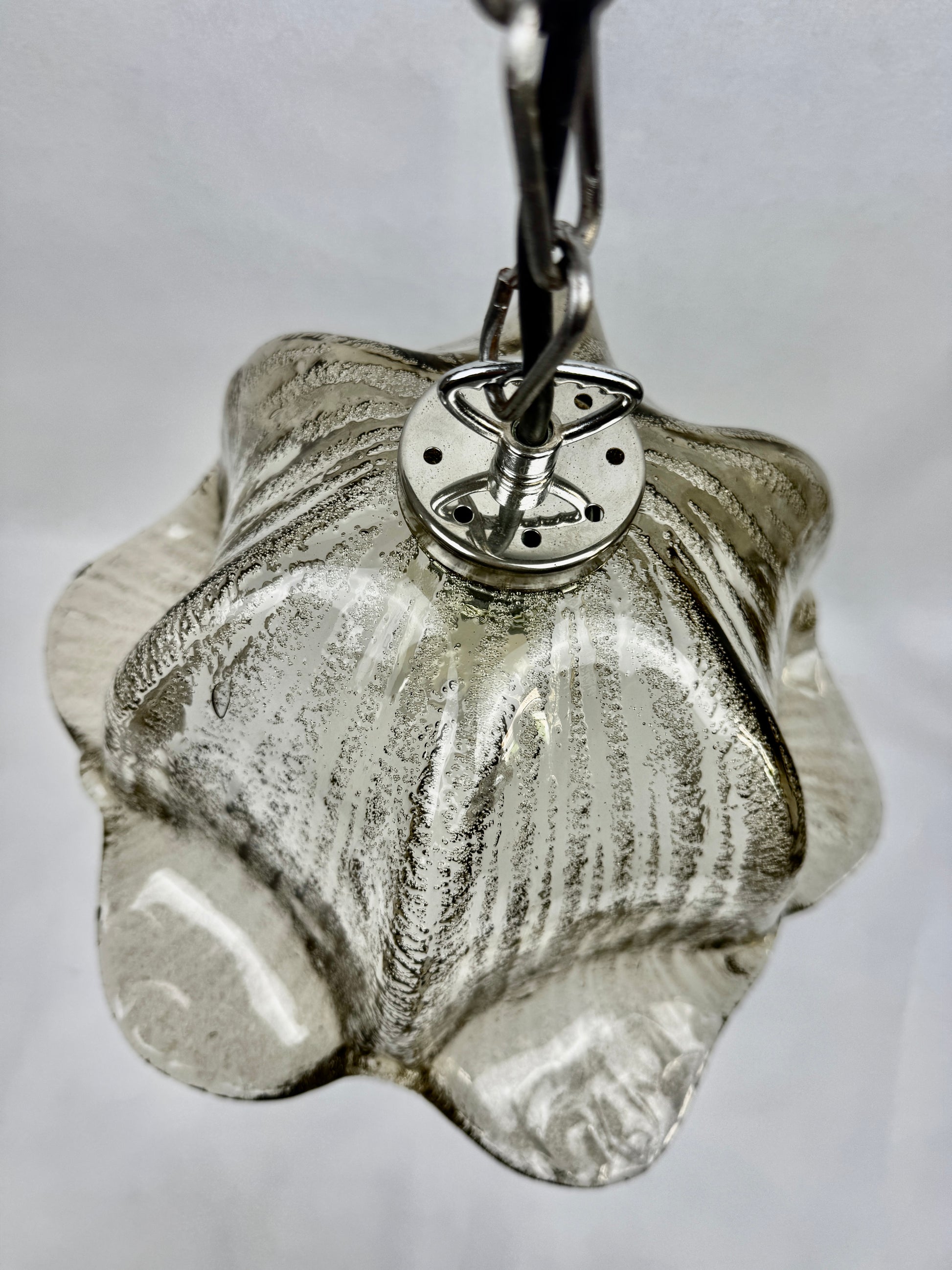 Fabrication allemande de belle qualité typique du design organique de la période : forme florale à six pétales, verre épais texturé à bulles d’air internes. Le verre est légèrement irisé selon l’éclairage, parfait pour un intérieur mid-century ou scandinave.