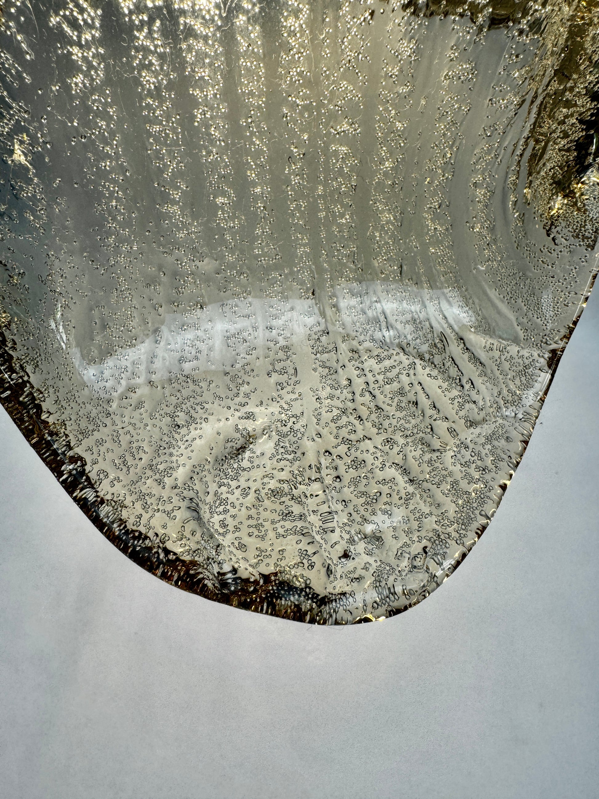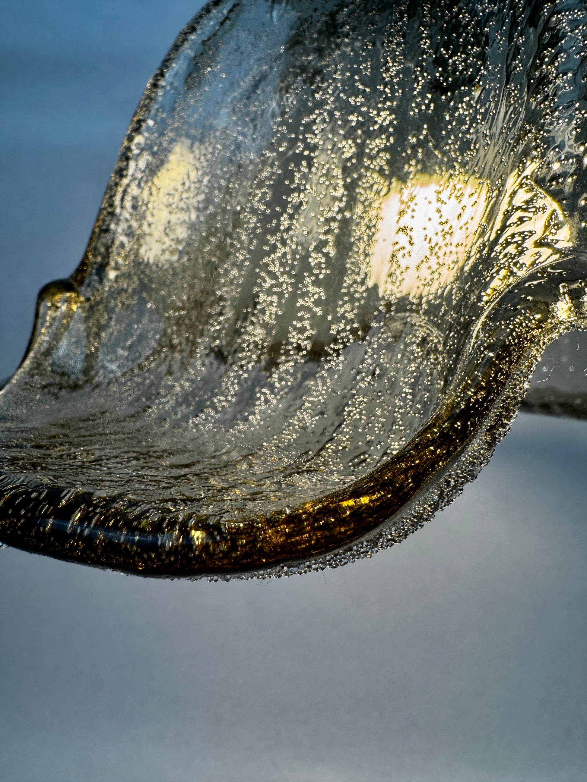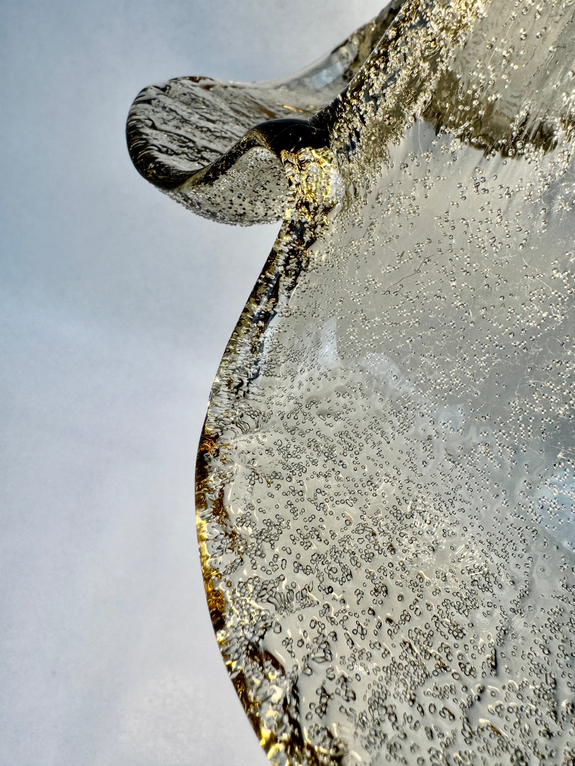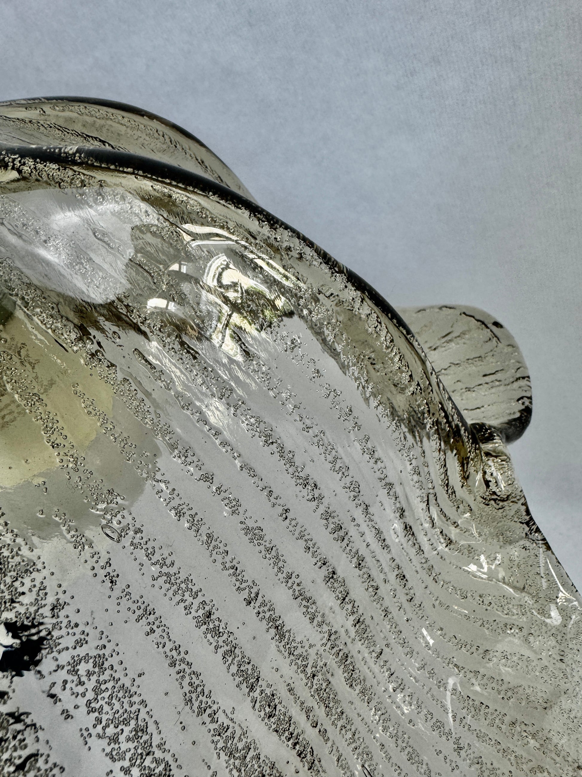 Fabrication allemande de belle qualité typique du design organique de la période : forme florale à six pétales, verre épais texturé à bulles d’air internes. Le verre est légèrement irisé selon l’éclairage, parfait pour un intérieur mid-century ou scandinave.