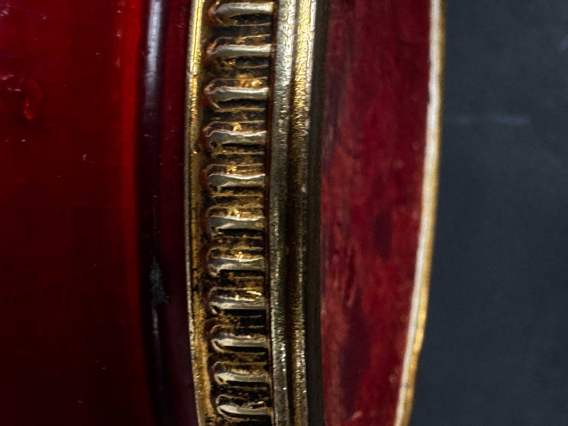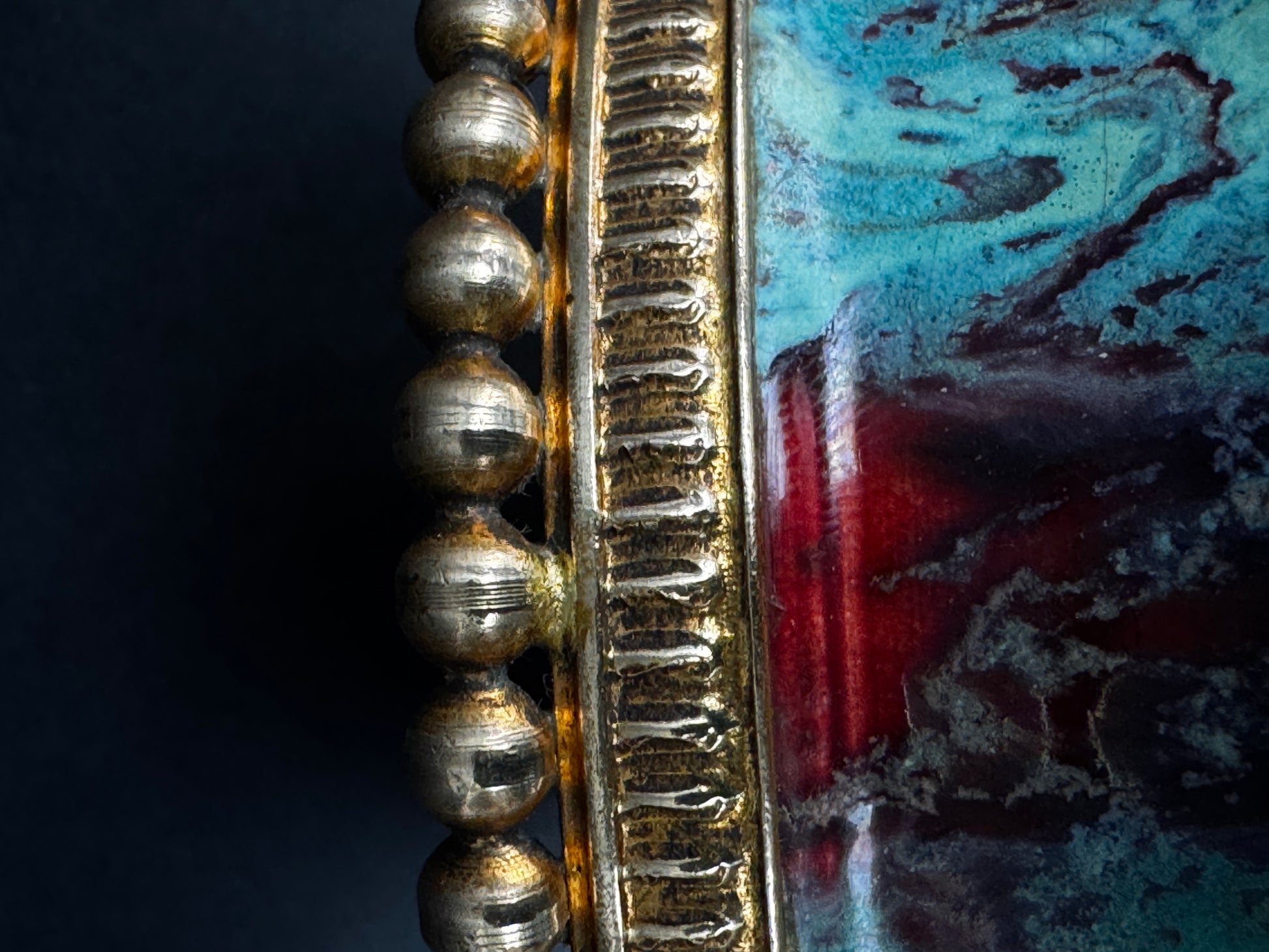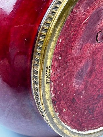 Monture en bronze doré travaillée, décorée de frises godronnées et de perles en relief sur le pourtour supérieur et inférieur. La glaçure, richement nuancée, offre des effets de cristallisation et de craquelures caractéristiques des ateliers CAB sous la direction de Félix Gête. Marque estampillée CAB et numéro 73 sous la base, mention FRANCE gravée sur le cerclage métallique.