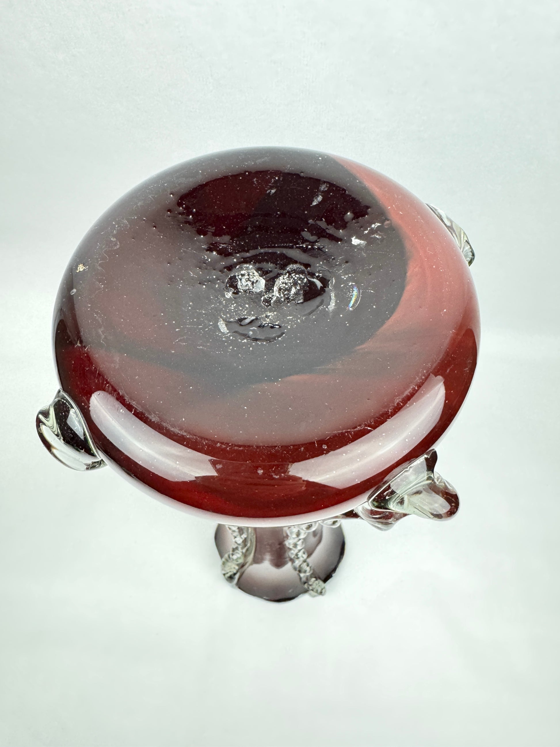 La transparence du verre clair et la teinte rubis intense évoquent les productions italiennes des années 1950-60. Le décor appliqué, réalisé à chaud, confère à la pièce une présence sculpturale. L’objet n’est pas signé mais s’inscrit clairement dans la tradition du verre d’art vénitien.