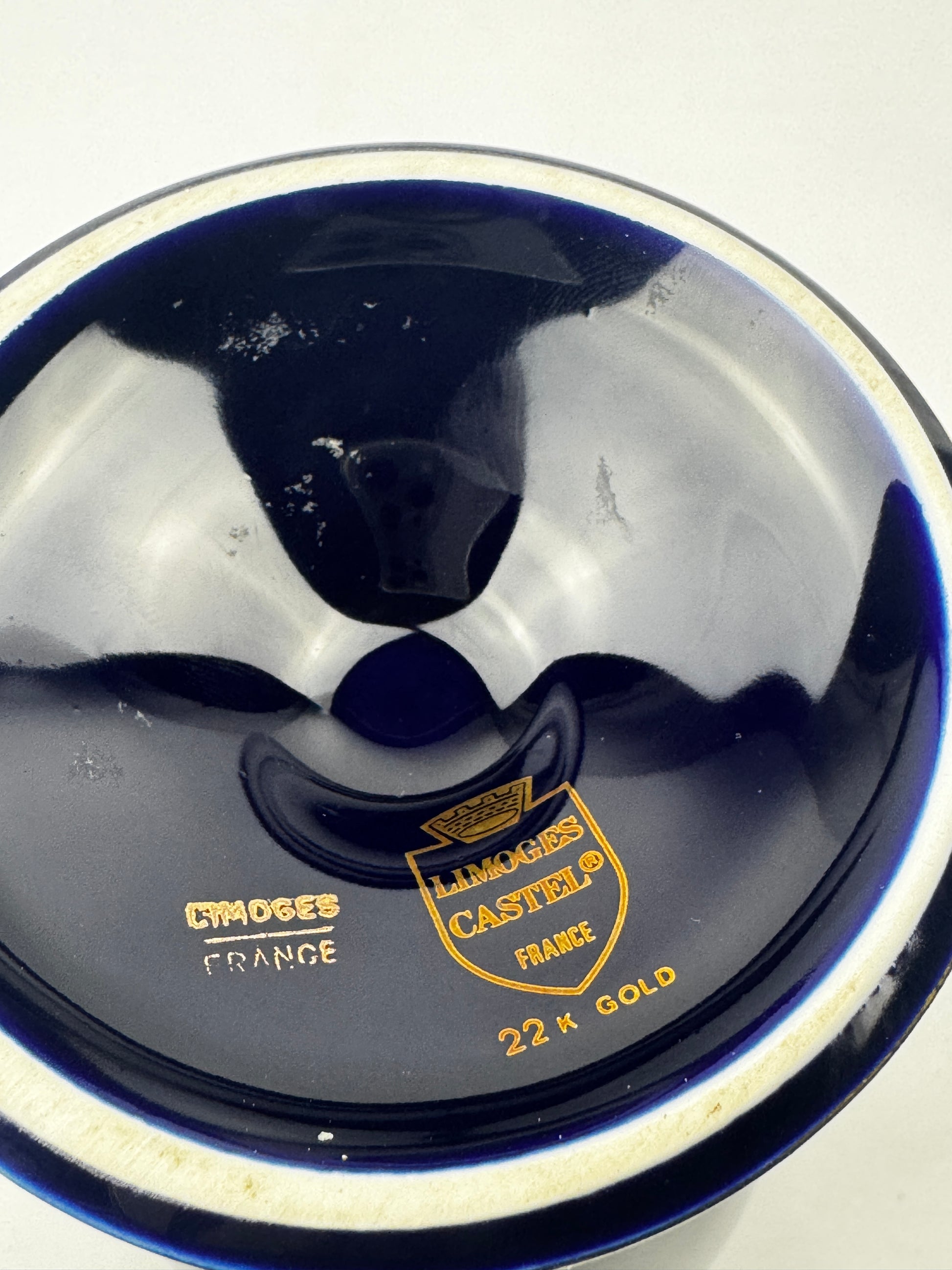 Vase en porcelaine fine de Limoges Castel, France, à décor romantique doré représentant une scène galante du XVIIIe siècle. Fond bleu de four profond, rehaussé d’un décor et d’une base dorés à l’or 22 carats. Travail français d’excellente qualité, typique des productions de prestige de Limoges dans la seconde moitié du XXe siècle.