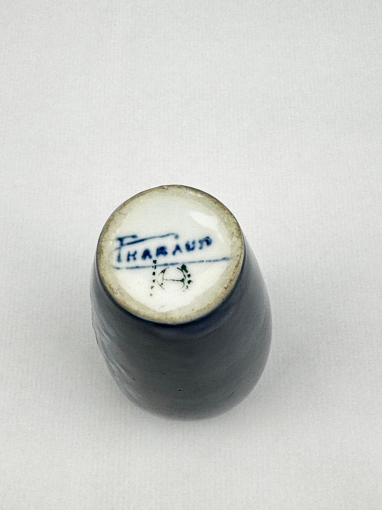 Petit vase en porcelaine de Limoges signé Tharaud, à décor en blanc sur fond bleu profond. Production des années 1930-1950, typique des pièces émaillées dites « bleu de four » que la maison Tharaud a perfectionnées durant l’entre-deux-guerres.